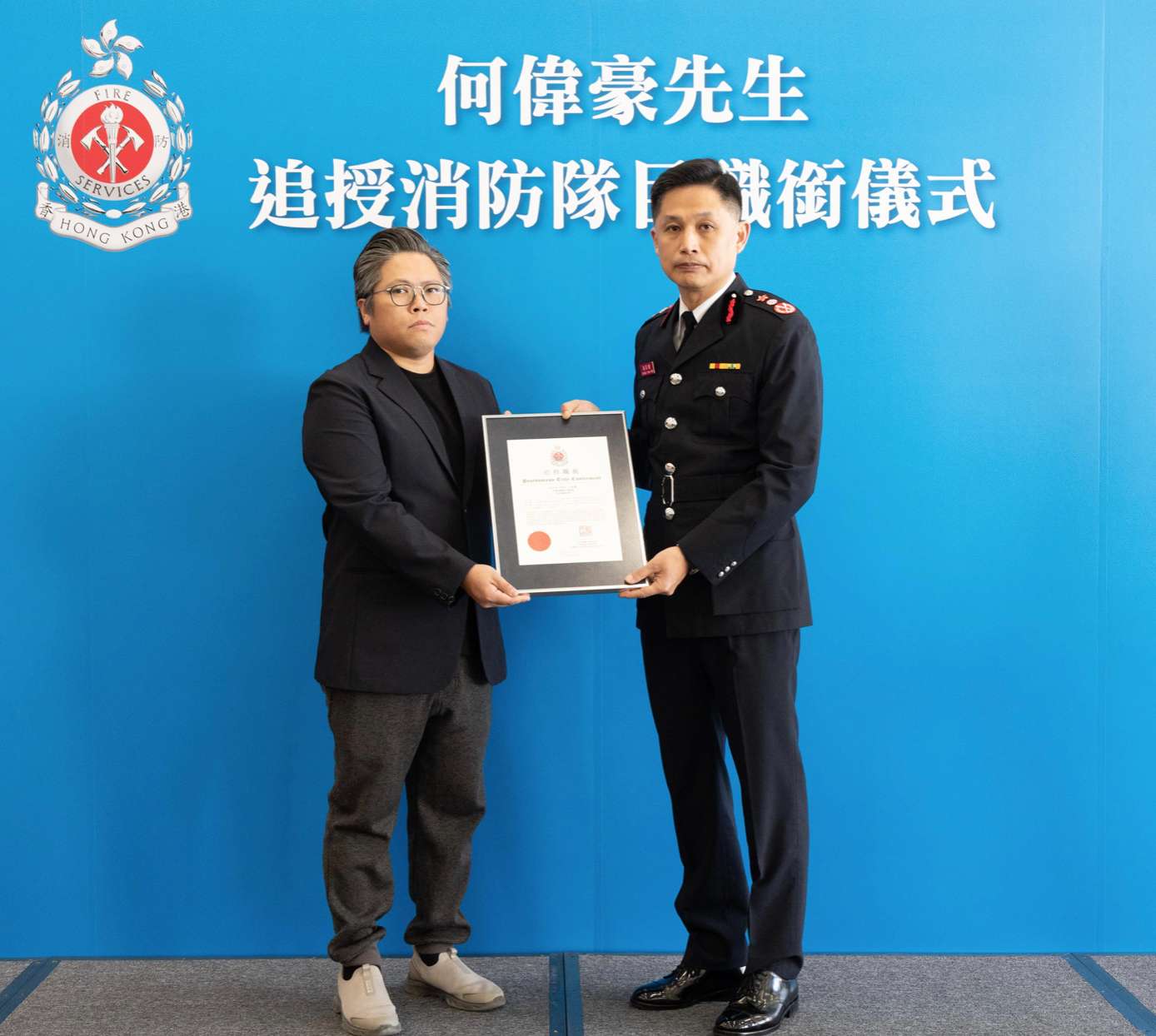 香港特区政府消防处11日向在大埔宏福苑火灾救援行动中殉职的消防员何伟豪追授消防队目荣誉职衔,以表扬其在执行灭火救援任务时堪称典范的服务及无私精神。