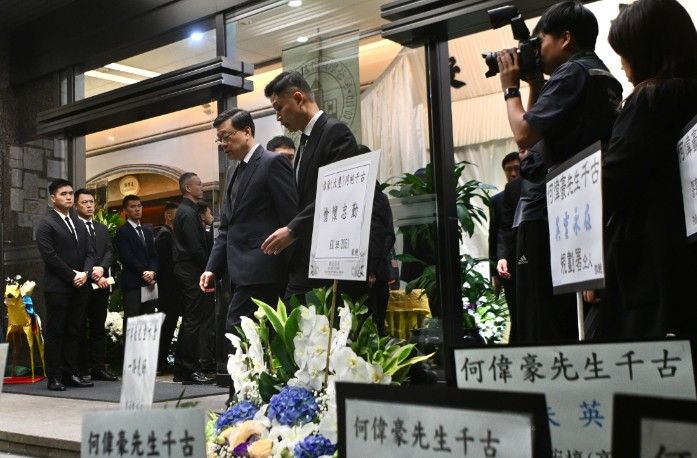 在香港大埔宏福苑火灾中殉职的消防员何伟豪,18日在位于红磡的世界殡仪馆设灵。全国政协副主席梁振英、香港特区行政长官李家超等人到场悼念。