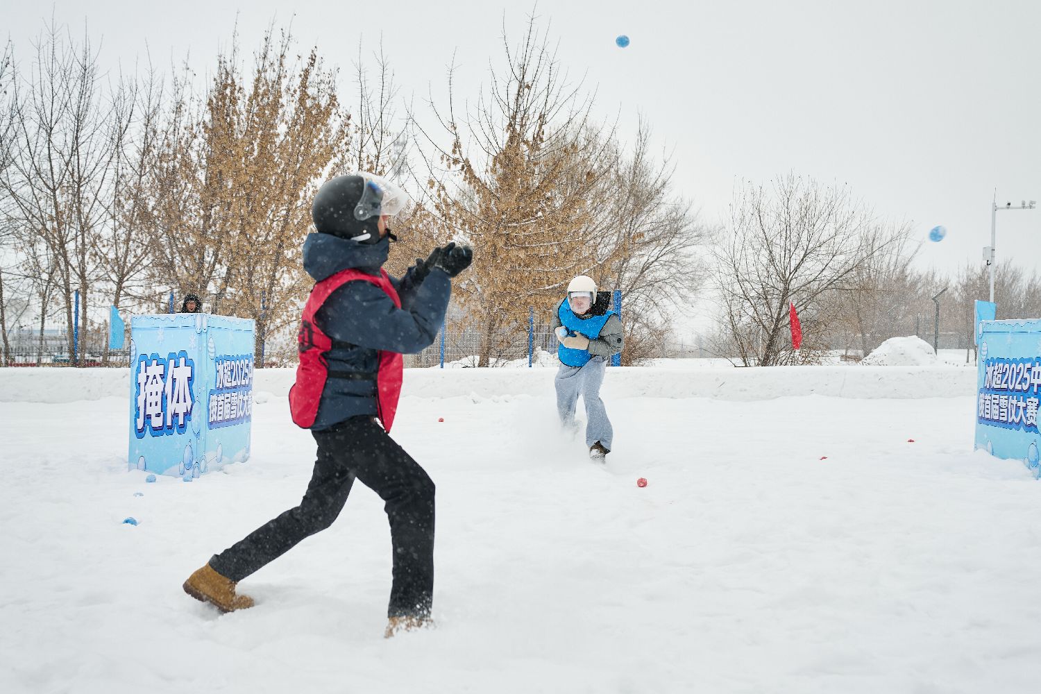 中新社报道,赛场内,6座迷彩冰雪掩体错落分布,红蓝两队的选手们佩戴专业护具,迅速进入“战斗”状态。选手们或依托掩体精准投掷雪球,或灵活走位迂回进攻。