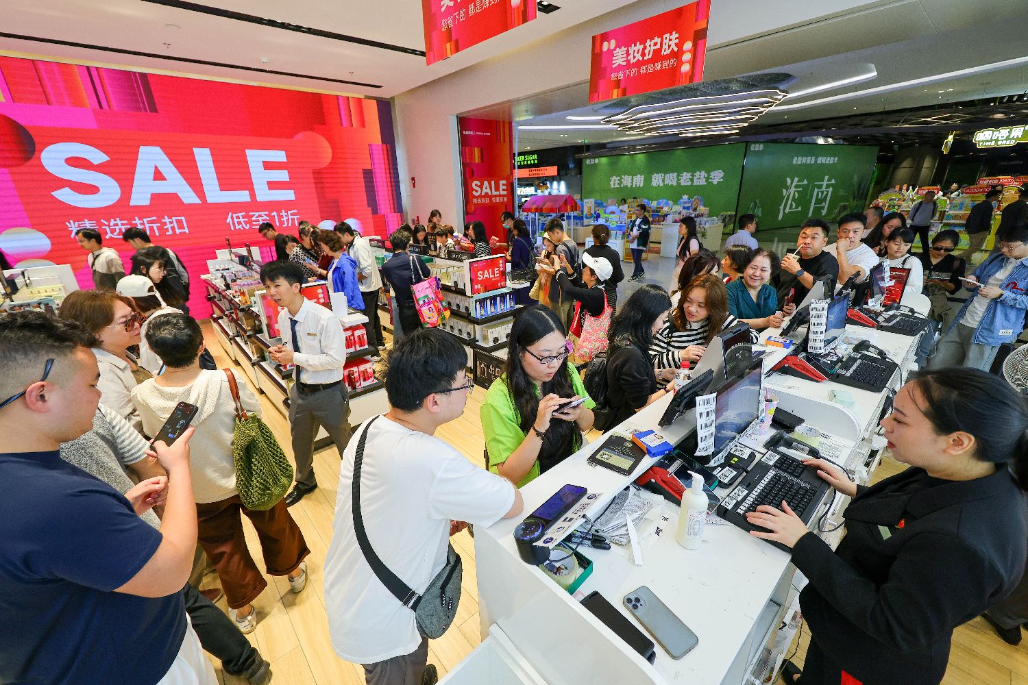 19日,顾客在海口国际免税城排队买单。中新社