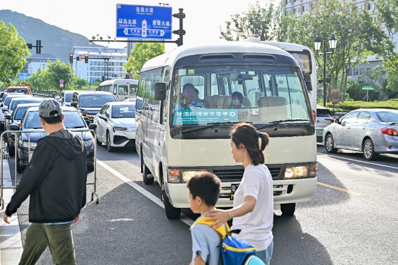 2025年9月1日,广东横琴粤澳深度合作区正式推出琴澳跨境学生专车服务。图为琴澳跨境学生专车抵达停靠点。中新社