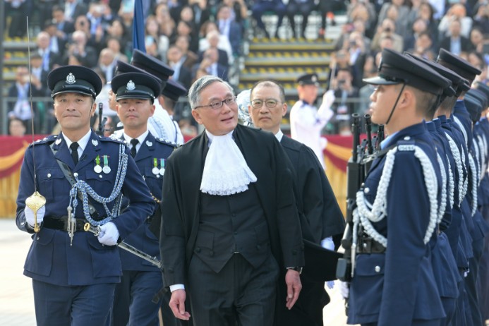 1月19日,香港特区2026年法律年度开启典礼在香港大会堂举行。图为香港特区终审法院首席法官张举能(前排中)在爱丁堡广场检阅香港警察仪仗队。中新社