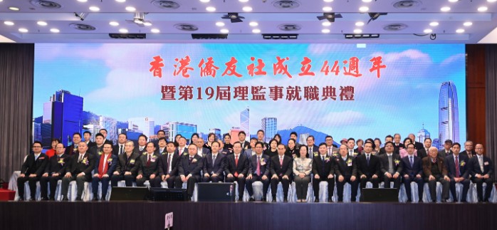 香港侨友社成立44周年暨第19届理监事就职典礼22日晚在港举行。海内外侨界人士及该社团会员等近600人与会。