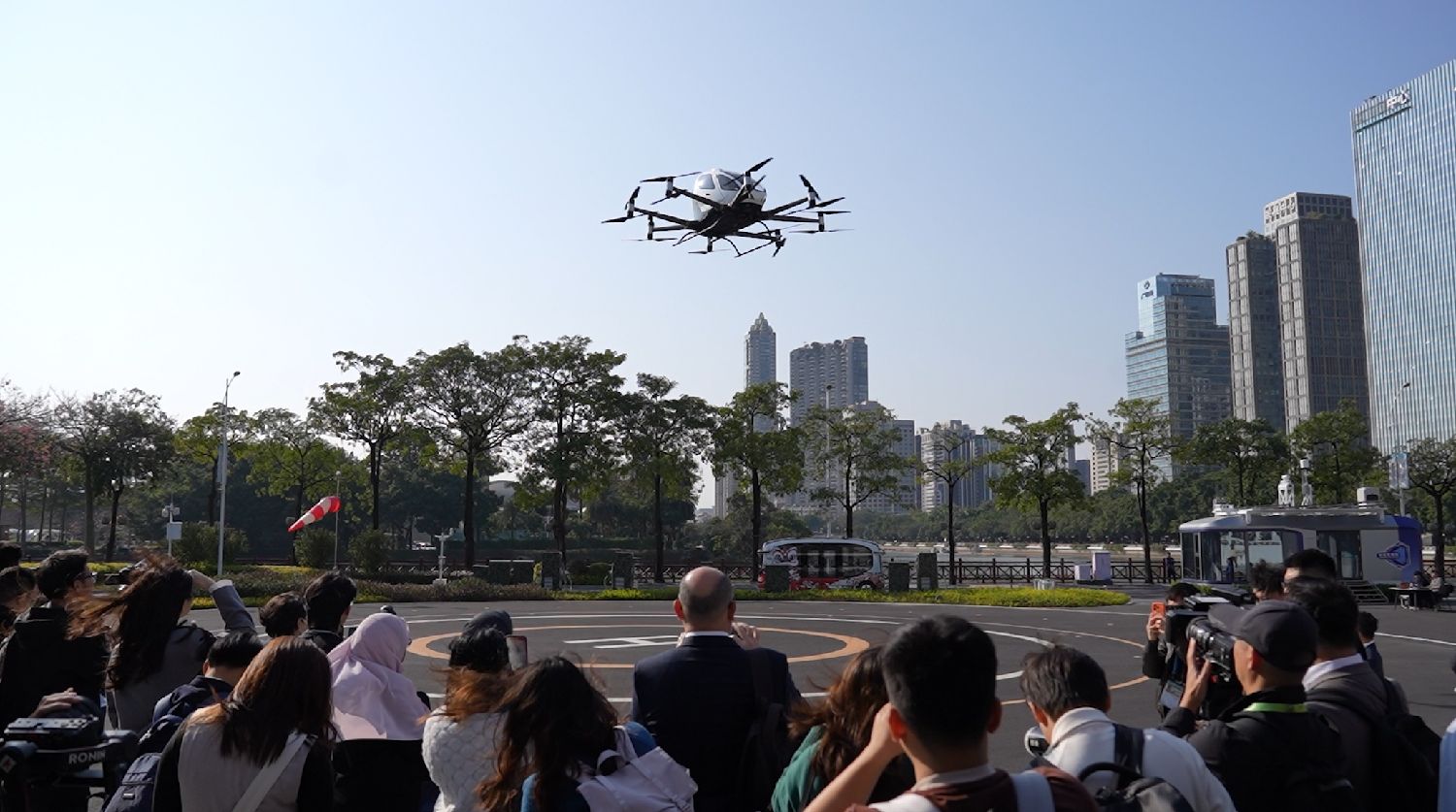 2日,广东广州,亚太经合组织(APEC)第一次高官会及相关会议参会代表参观飞行汽车。中新社