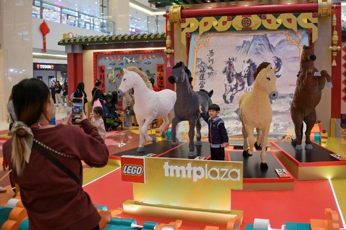 中新社报道,屯门市广场以国画大师徐悲鸿画中的马为灵感,用40万块积木打造“新春骏艺乐园”。以4匹高达两米的立体骏马,搭配背景墙上的两匹水墨马,还原《六骏图》;用20万块积木通过3D幻视艺术呈现《奔马图》;将AI(人工智能)与传统书画结合制作走马灯投影互动游戏,使该乐园成为香港新春热门打卡地。
