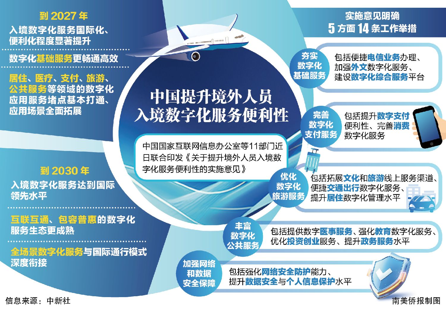 中新社5日报道,上述实施意见提出,到2027年,入境数字化服务国际化、便利化程度显著提升,数字化基础服务更加畅通高效,居住、医疗、支付、旅游、公共服务等领域的数字化应用服务堵点基本打通、应用场景全面拓展,为扩大高水平对外开放注入强劲活力;到2030年,入境数字化服务达到国际领先水平,互联互通、包容普惠的数字化服务生态更加成熟,全场景数字化服务与国际通行模式深度衔接,数字化服务高水平开放促进经济社会高质量发展能力显著增强。