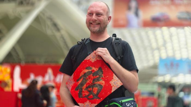 一名外籍旅客被红纸墨香吸引,从书法家那里取得了一个“福”字。“新年快乐,谢谢。”他将福字拿在手中,一边拍照留念,一边笑着用中文说道。