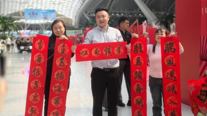人群中,来自湖南的马先生拿到“马踏祥云路春铺富贵门”的春联后,特地多要了一副。“我弟弟过年也要留守在工地,回不了家。”他不好意思地笑笑:“春联就是‘家的召唤’,贴上了,就算人没有在一起,心里也是暖的。”不远处,广州南站客运员正把写好的福字陆续送给过往的旅客。“阿姨,这是送给您的福字,祝您一路平安,新年快乐!”“谢谢!这福字写得太好了。”旅客惊喜地接过福字,脸上洋溢着幸福的笑容。
