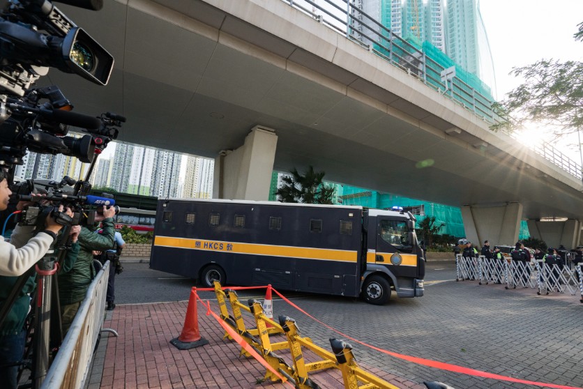 2月9日,黎智英案在香港西九龙裁判法院宣布判刑,图为押送黎智英的惩教署车辆驶入西九龙裁判法院。中新社
