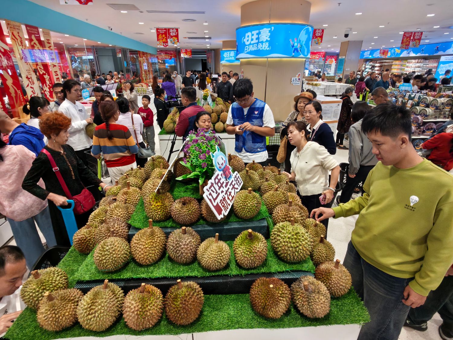 在诸多商品中,榴莲最受青睐。海口旺豪日用消费品免税店上架了马来西亚猫山王榴莲和黑刺榴莲。售货员林肖说:“黑刺榴莲半个小时卖了一多半,我们在不停补货。”