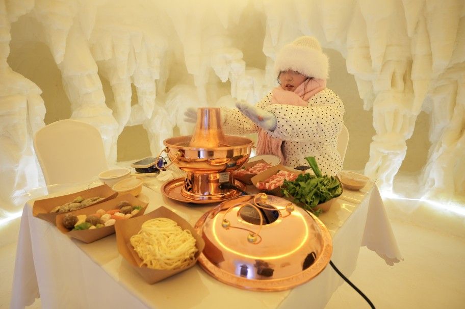 1月20日,黑龙江哈尔滨,游客在雪屋品尝火锅。中新社