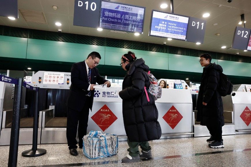 2月2日,南航工作人员在上海虹桥国际机场T2航站楼内,与携带宠物的旅客交流。中新社