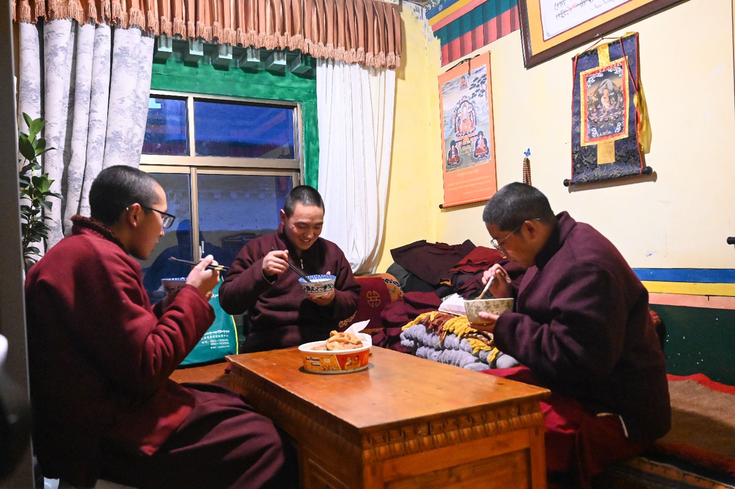 夜幕降临,“古突”入锅,随着搅动,香气弥漫整个厨房。格桑米玛出家前曾获得过厨师证,所以是师兄弟里最擅长做饭的,“川菜的回锅肉、鱼香肉丝,还有面食蒸包子都会做。”