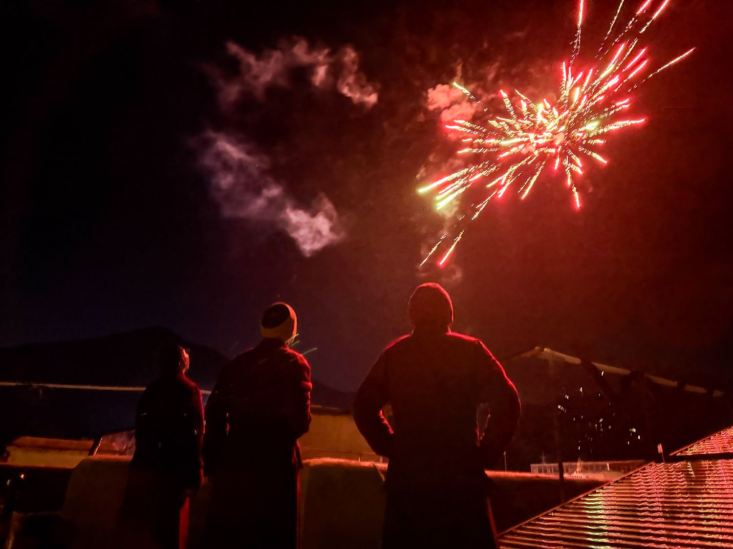 吃过“古突”,夜色渐暗,桑耶寺隔壁的社区放起了烟花,格桑米玛和师兄弟走上房顶观看,迎接辞旧迎新的时刻。