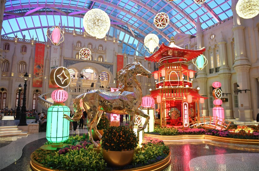 2月13日,澳门美高梅天幕广场装饰马年新春物品。中新社