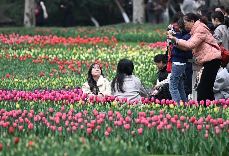 3月6日,游人在郁金香花田边拍照。当日,“爱如繁花”2026太子湾郁金香花展在浙江杭州西湖启幕,次第开放的40万株郁金香成为当地春日热门打卡点,民众徜徉花田感受春日气息。中新社