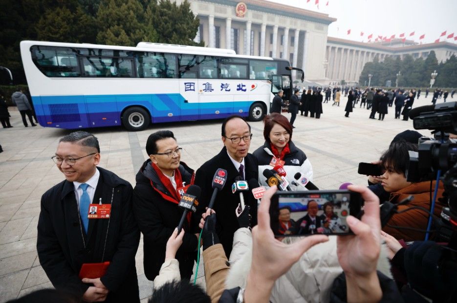 3月4日,十四届全国人大四次会议在北京人民大会堂举行预备会议。图为会前,香港特区全国人大代表接受媒体访问。中新社