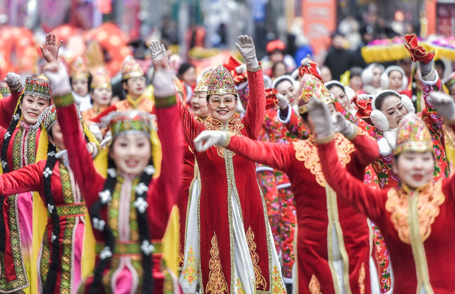 5日,新疆乌鲁木齐市闹市区西门老街锣鼓喧天,一场社火展演游街活动在此举行,吸引众多过往市民驻足观看。中新社