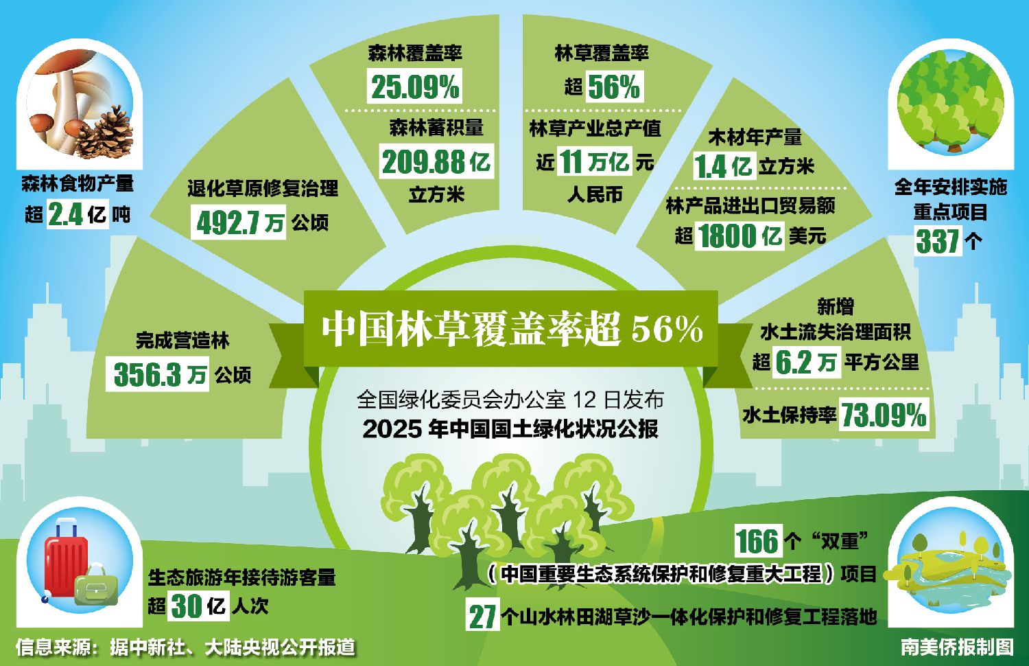 中新社报道,在当天举办的中国国家林业和草原局(简称“国家林草局”)新闻发布会上,国家林草局生态保护修复司司长张利明介绍上述公报内容。过去一年,中国持续推进大规模国土绿化行动,全国完成营造林面积356.3万公顷、退化草原修复治理面积492.7万公顷,森林覆盖率达到25.09%、林草覆盖率超过56%、森林蓄积量达到209.88亿立方米。