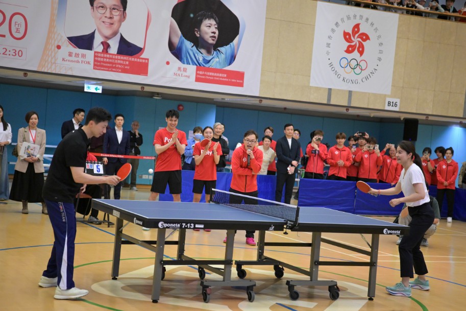 3月20日,“体育的华丽蜕变:再创高峰”论坛在香港理工大学举行。图为中国乒乓球运动员马龙(左)与郭晶晶进行乒乓球互动。中新社