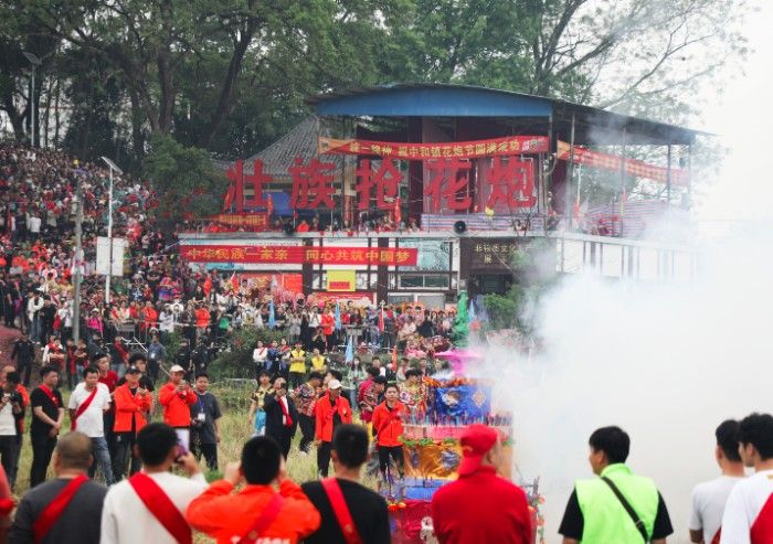 3月20日,一年一度的壮族抢花炮民俗活动在广西南宁市邕宁区中和镇孙头坡举行。图为活动现场。中新社
