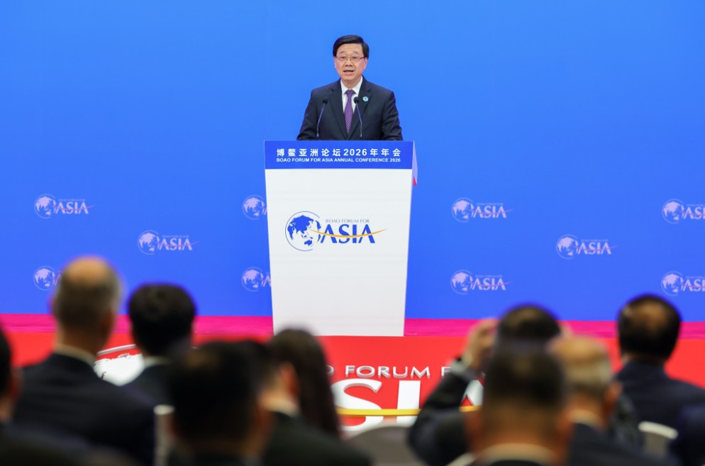 3月24日,作为博鳌亚洲论坛2026年年会系列活动之一的全球自由贸易港发展论坛在海南博鳌举行。图为香港特别行政区行政长官李家超出席论坛并致辞。中新社