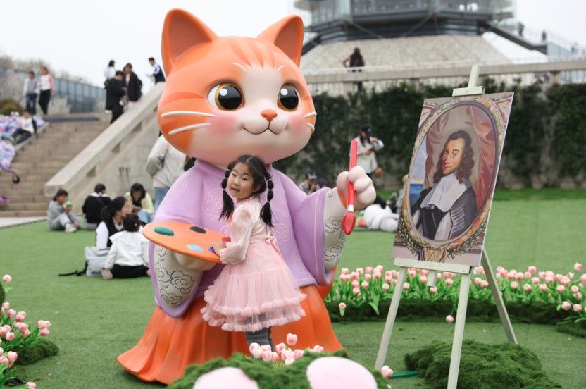 4月2日,孩子在大报恩寺遗址博物馆与展陈合影。正值江苏地区中小学生春假,南京大报恩寺遗址博物馆通过主题巡游、NPC互动、光影艺术、遗址课堂等多元形式吸引青少年前来,让青少年在趣味互动中感受历史文化。中新社