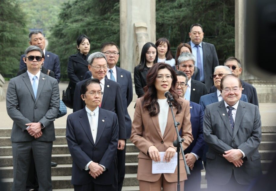 4月8日,中国国民党主席郑丽文率领国民党访问团拜谒中山陵。图为郑丽文拜谒中山陵后发表感言。中新社