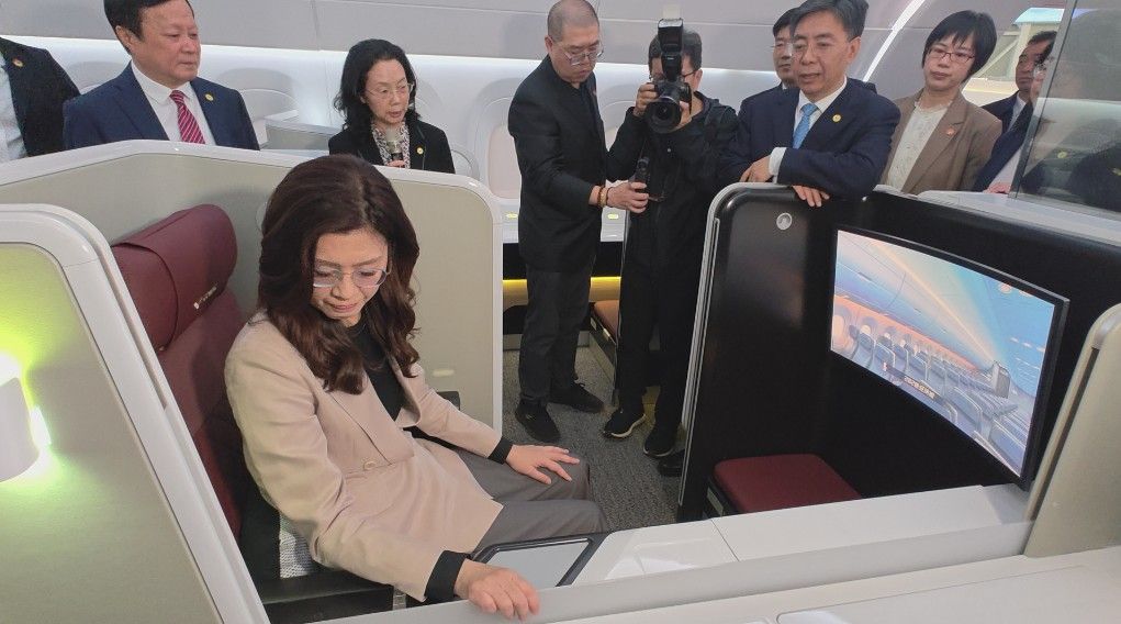 4月9日,中国国民党主席郑丽文一行参观中国商飞上海飞机设计研究院。图为郑丽文在C929样机的机舱内部参观。中新社