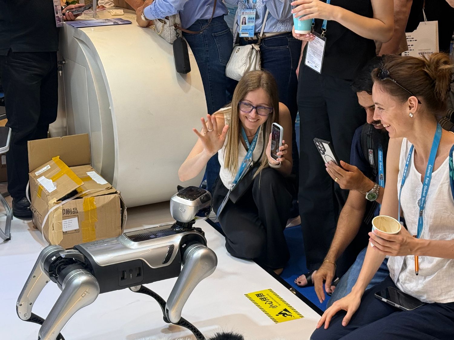 15日,广东广州,第139届广交会开幕,机器狗等创新产品吸引海外采购商关注。中新社