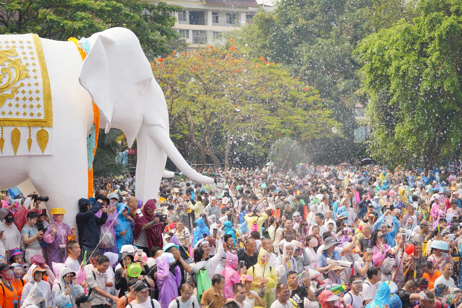 傣族、布朗族、德昂族等各族民众15日在云南省西双版纳傣族自治州景洪市泼水广场上,与来自中国各地及泰国、老挝、美国等国家和地区的游客,端起水盆、举起水枪,互送祝福,尽情享受“泼天的欢乐”。