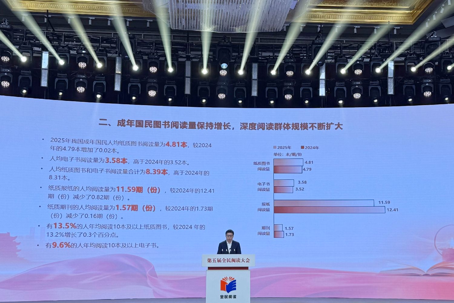 调查结果显示,中国成年国民图书阅读量保持增长,深度阅读群体规模不断扩大。从成年国民对各类出版物阅读量看,2025年中国成年国民人均纸质图书阅读量为4.81本,年均阅读10本及以上纸质图书占13.5%,年均阅读10本及以上电子书占9.6%。