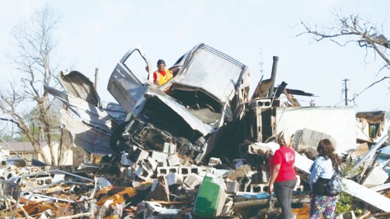 25日,美国密西西比州罗林福克镇,民众查看房屋车辆受损情况。中新网