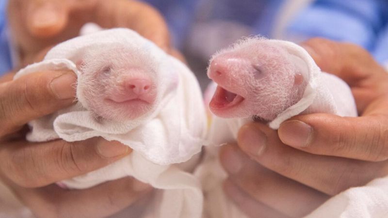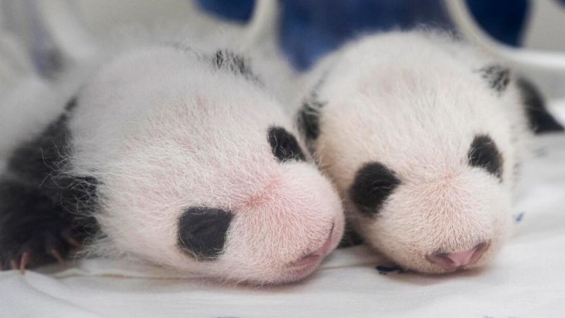 当地时间8月7日,韩国三星爱宝乐园公布雌性双胞胎大熊猫幼崽(左为姐姐,右为妹妹)出生第6天的照片。