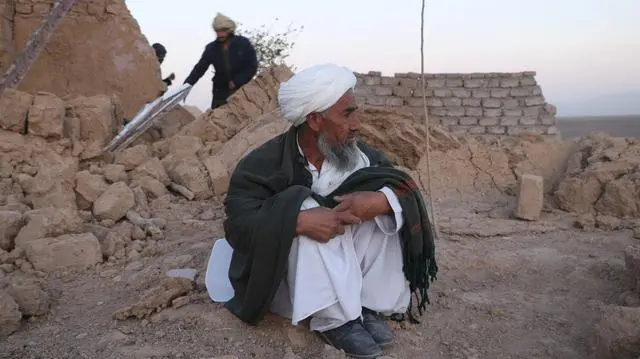 在阿富汗赫拉特省,一名老人坐在自家坍塌的房屋前。 新华社
