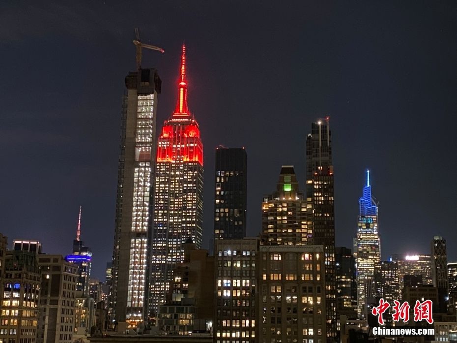 2月8日晚,纽约帝国大厦楼顶点亮“中国红”,庆祝农历甲辰龙年的到来。中新社