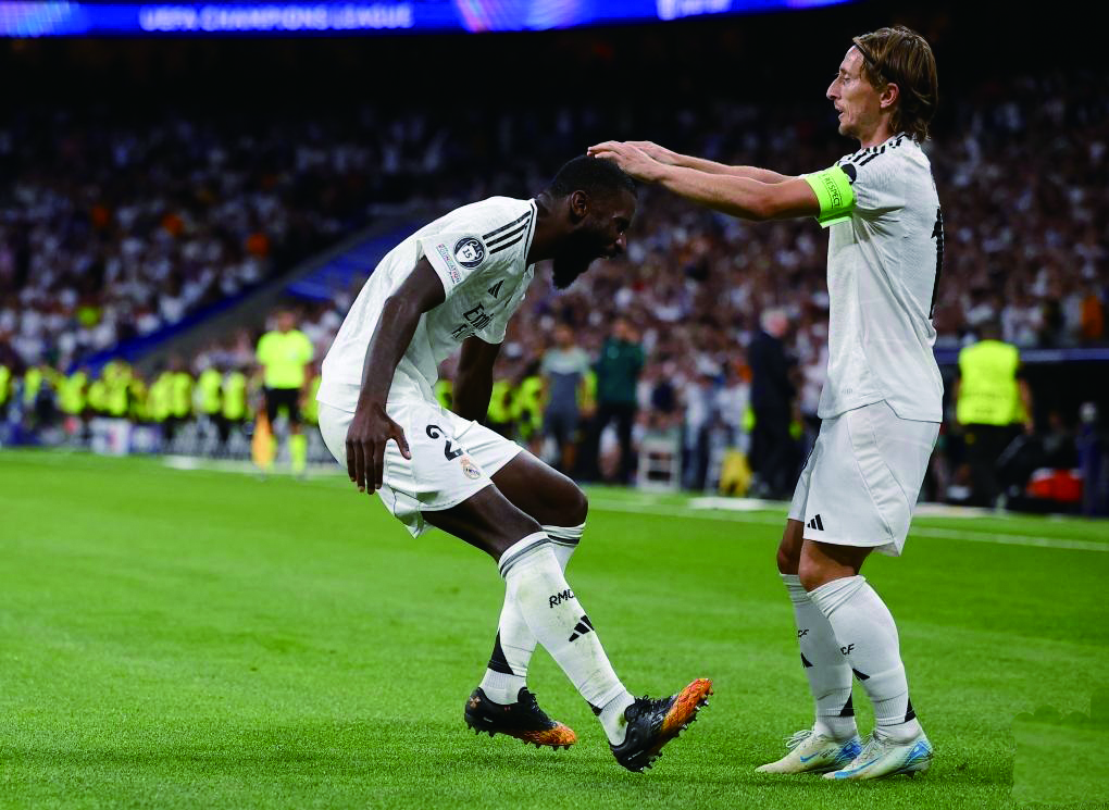 9月17日,皇马球员吕迪格(左)进球后与队友莫德里奇庆祝。新华社