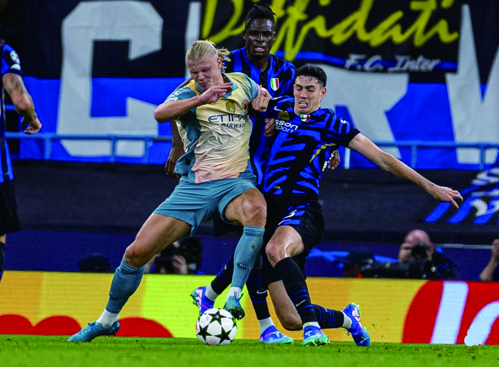 9月18日,国际米兰球员严密防守曼城前锋哈兰德(左)。新华社