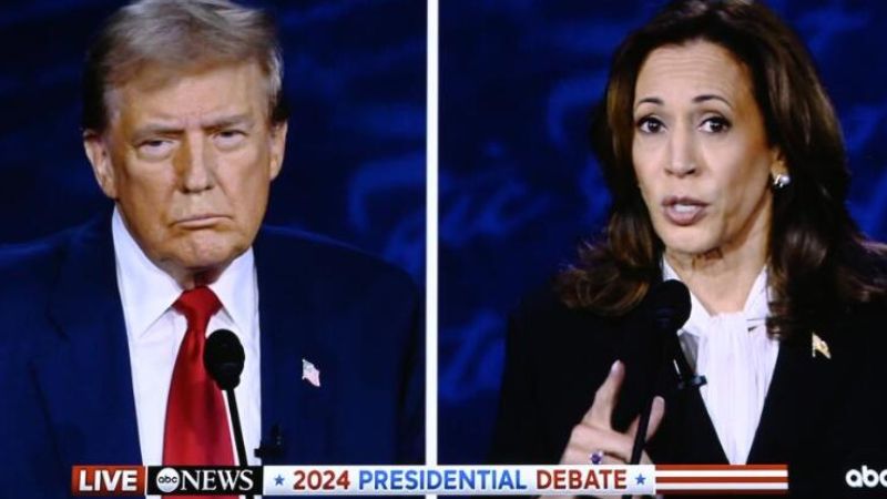 这张9月10日在美国费城总统辩论媒体中心拍摄的视频直播画面显示,美国副总统、民主党总统候选人哈里斯(右)和美国前总统、共和党总统候选人特朗普在费城参加电视辩论。新华社