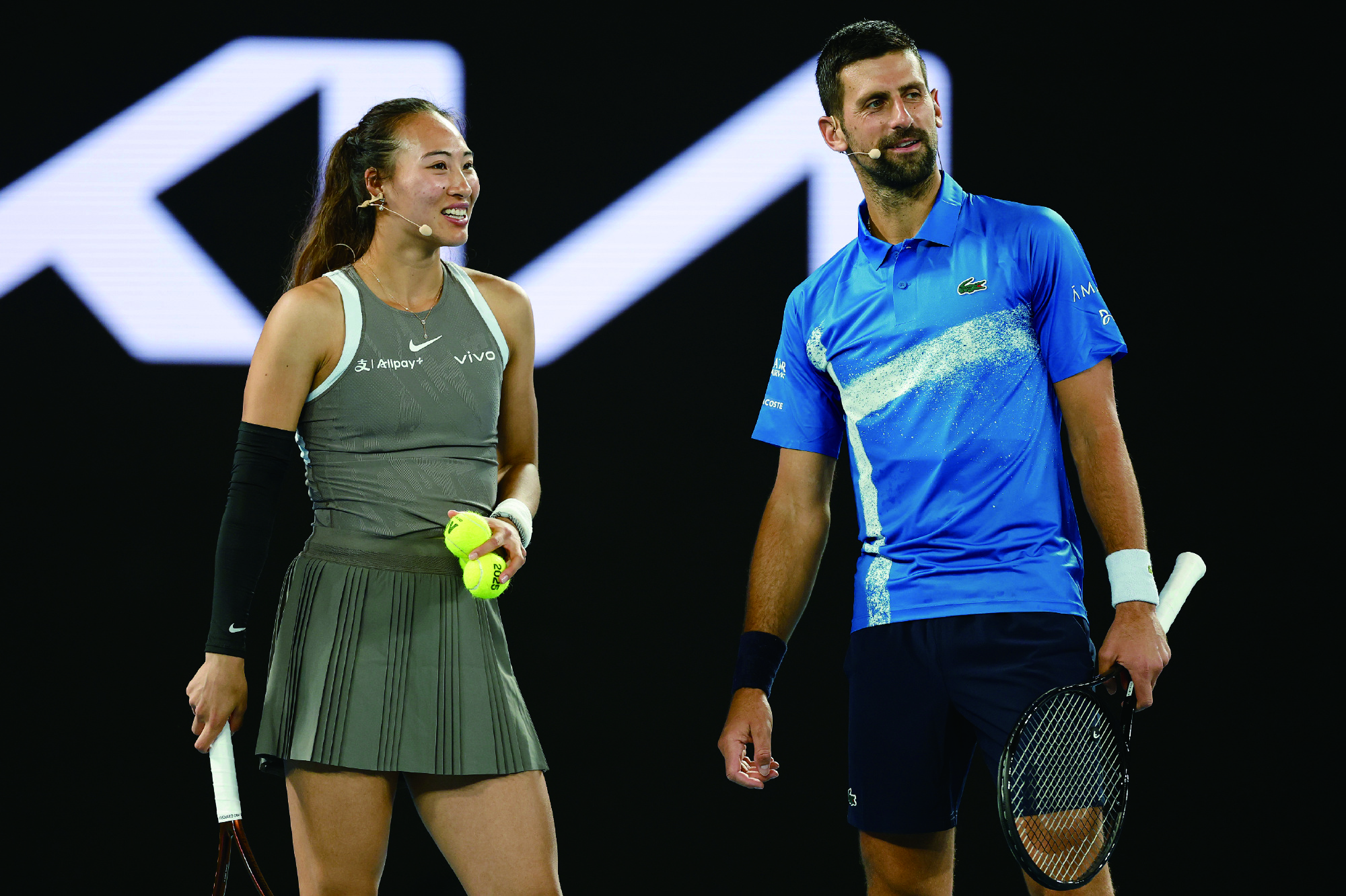 1月9日,郑钦文(左)和德约科维奇搭档出战澳网慈善表演赛混双比赛。 澳网官微