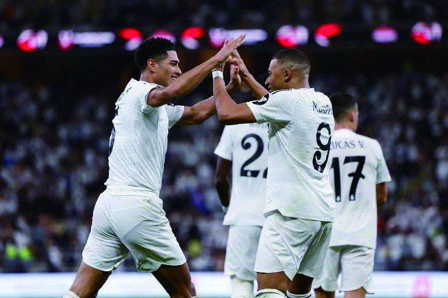 1月9日,皇马球员贝林厄姆(左)和姆巴佩击掌庆祝。 新浪体育
