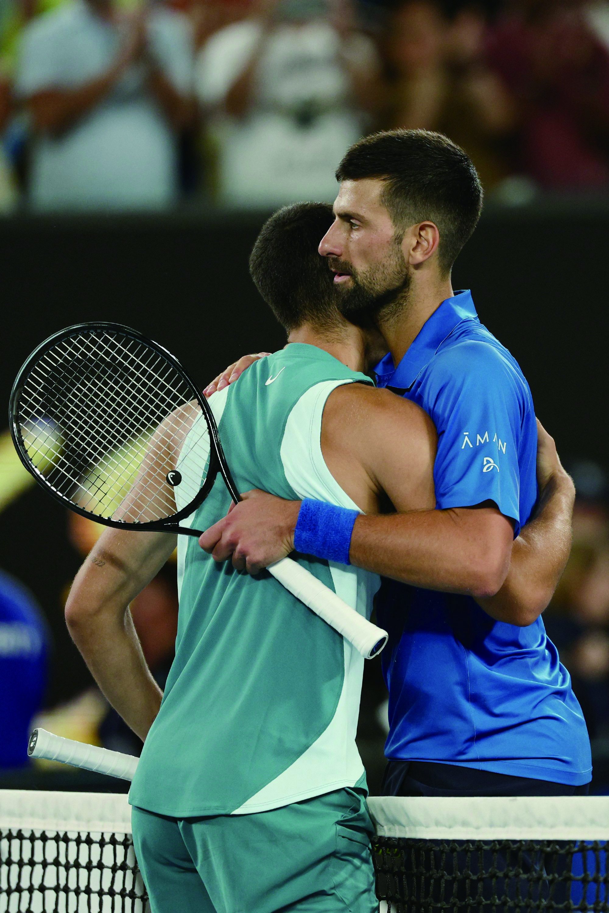 1月21日,德约科维奇赛后和阿尔卡拉斯拥抱。 澳网官微