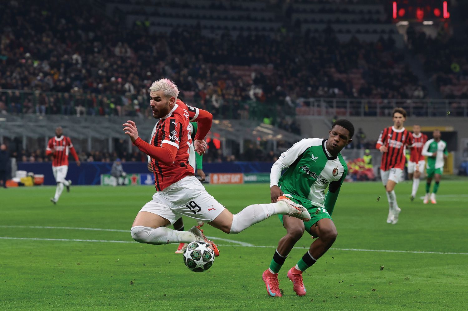 AC米兰虽然取得梦幻开局,但并没有把握住扩大比分的机会,还为被逆转埋下伏笔。第44分钟,特奥因为拼命拉扯费耶诺德前锋穆萨的球衣吃到黄牌。第51分钟,特奥突入禁区倒地,主裁判认为他假摔,并对他出示黄牌。特奥觉得自己很冤枉,但是主裁判很坚决,特奥累积两黄变一红被罚出场。