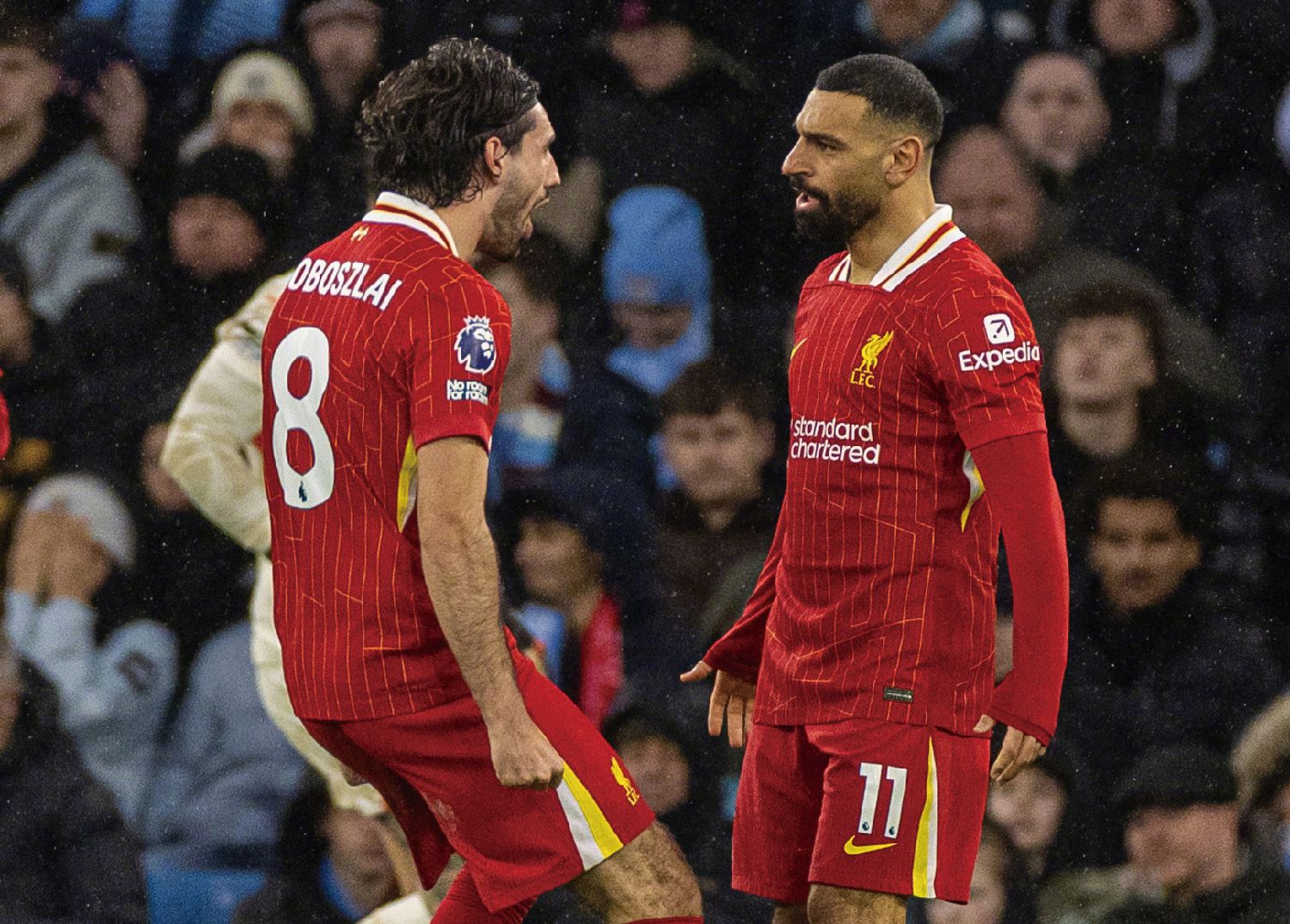 2月23日,利物浦球员萨拉赫(右)和索博斯洛伊庆祝进球。 利物浦官微