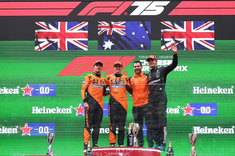 新华社报道,根据前一天排位赛成绩,除了皮亚斯特里,头排发车的还有拉塞尔,诺里斯排第三位。灯灭起跑,皮亚斯特里凭借超快反应取得领跑位,诺里斯迅速超越拉塞尔来到第二位。最终,迈凯伦两位车手在毫无悬念中包揽前两名。