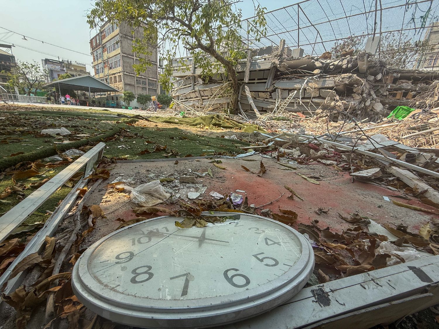 当地最大的华文学校曼德勒孔教学校四个校区受灾情况不一。在学校北校区,几栋教学楼在地震中坍塌,一台时钟正孤零零地“躺”在废墟中,时间定格在地震发生的一刻。