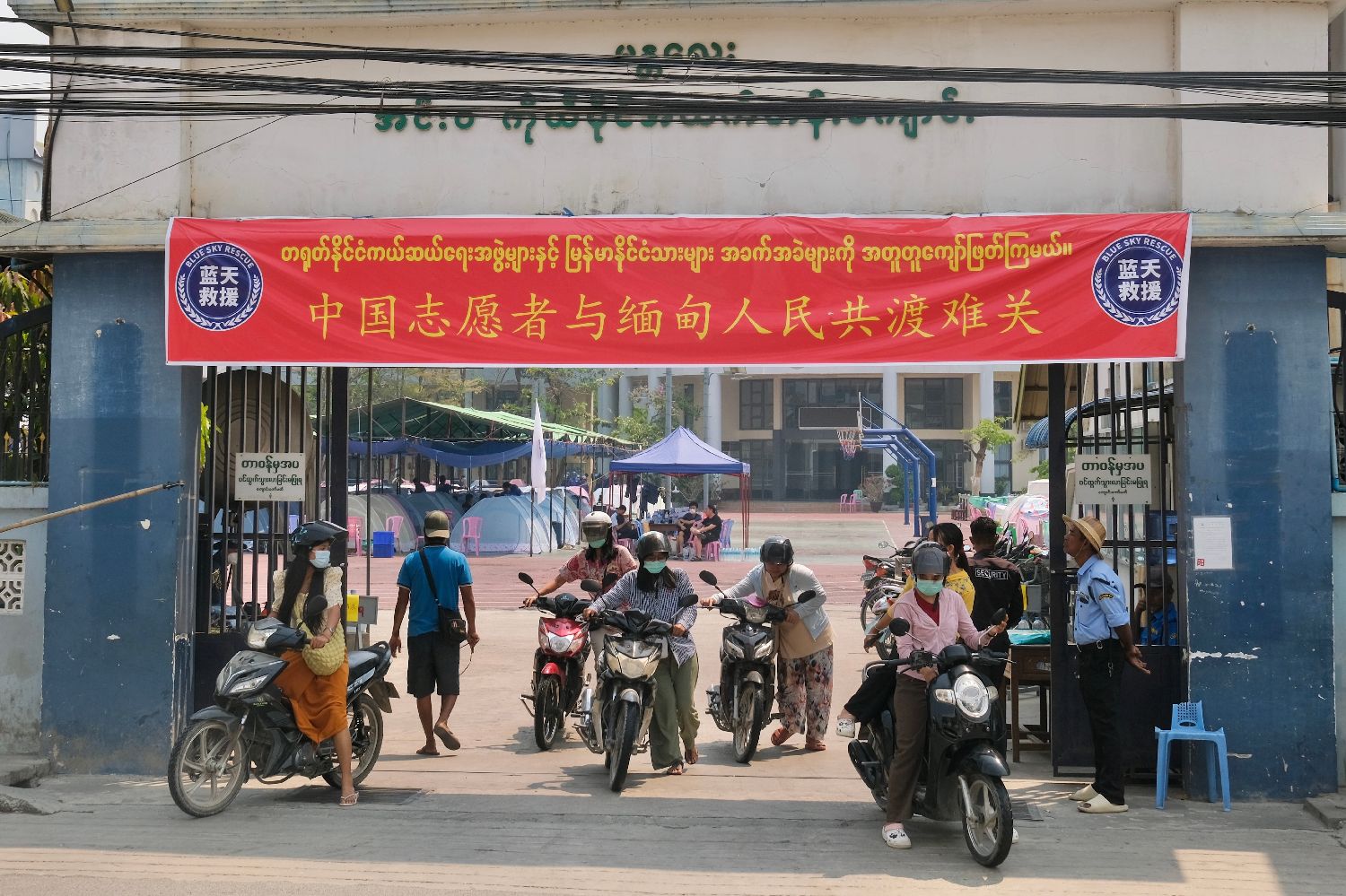 在曼德勒街道上,多辆挖掘机正在清理废墟,救援队和志愿者正在有条不紊地善后。一所学校门口悬挂着一条中缅双语横幅,上书“中国志愿者与缅甸人民共渡难关”。