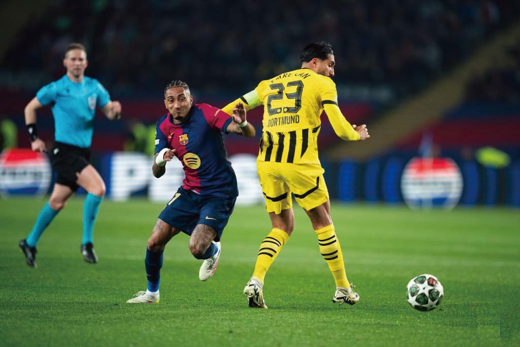 4月9日,巴萨球员拉菲尼亚(左)与多特蒙德球员埃姆雷·詹在比赛中拼抢。 新华社