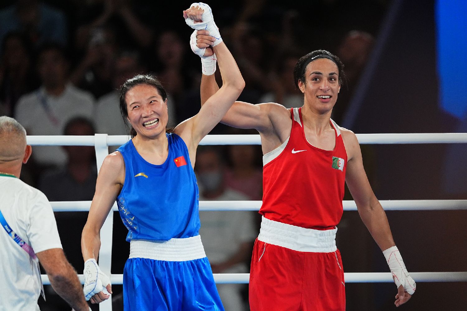 巴黎奥运会女子66公斤级冠军阿尔及利亚选手哈利夫(右)被曝有男性染色体。 中新社