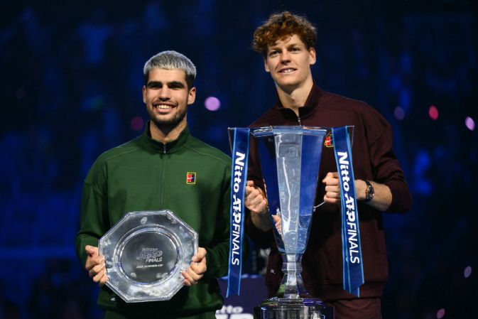 11月16日,辛纳(右)和阿尔卡拉斯在颁奖仪式上。ATP官微